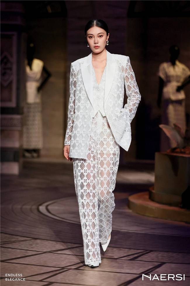 在工艺呈现上,NAERSI以佛罗伦萨的百年徽记“百合”为灵感,推出佛罗伦萨Merletto丝绣工艺系列等时装臻作。通过佛罗伦萨针绣、艺术镂空、立体格艺等细腻笔触,NAERSI将西方古典美学与东方优雅意境深度融合。大秀特设的优雅工坊静态展区更是一大亮点,通过多维度展陈让宾客得以近距离感受高级时装从工艺到精神的完整叙事,感受高端成衣背后的自在静雅的产品理念与臻质隽永的匠心传承。这既是NAERSI对品牌初心的坚守,亦完整诠释了NAERSI从本土高端品牌向国际轻奢品牌转型的设计逻辑与美学体系跃迁。