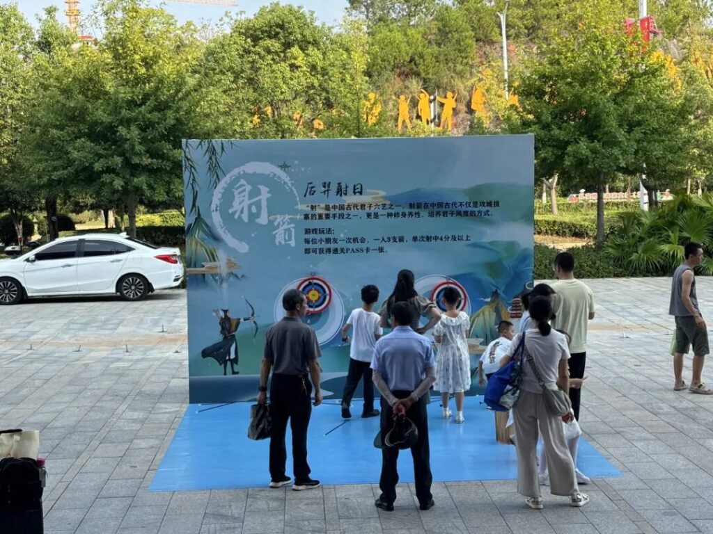 射箭区排起长队,小选手们在教练指导下挽弓搭箭。《易经》有云:“弧矢之利,以威天下。”如今,弓箭不再是征战工具,而是培养孩子们专注沉静、君子风范的教具。每一支离弦之箭,都是对传统射礼的现代诠释。