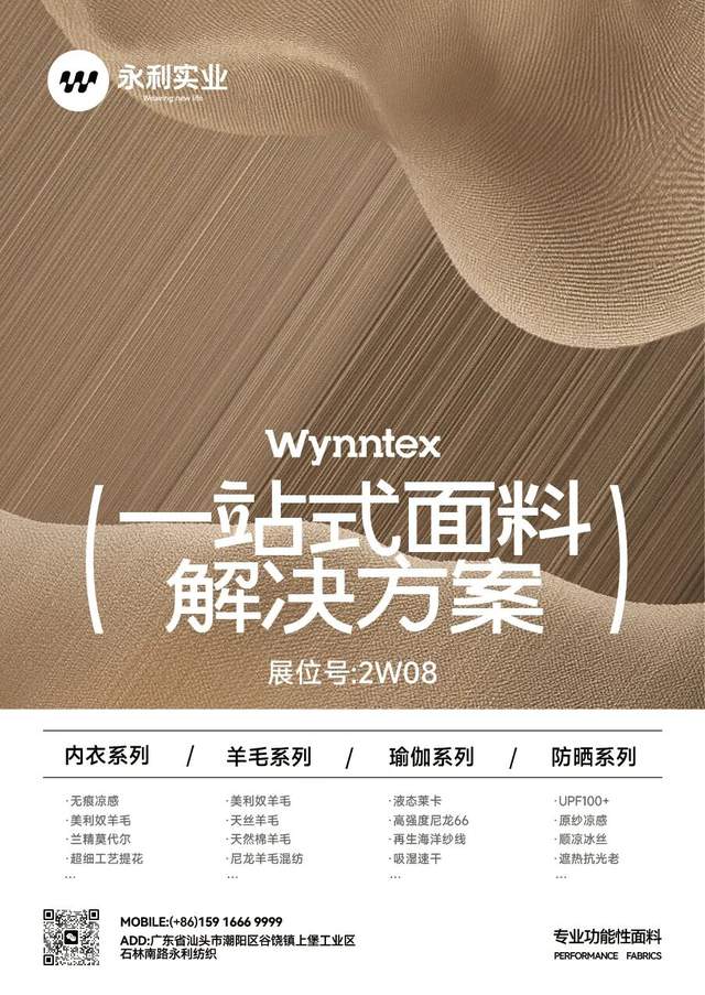 永利纺织实业有限公司于2018年在中国成⽴,拥有两个开发中⼼(⼴东汕头、⼴东中⼭)和三个⽣产基地,旗下员⼯200+,拥有经纬编等纺织设备200+,汇聚国内外最先进的⽣产设备及国际领先⽔平的纺织技术,能真正做到⾯料成⾐⼀站式服务。