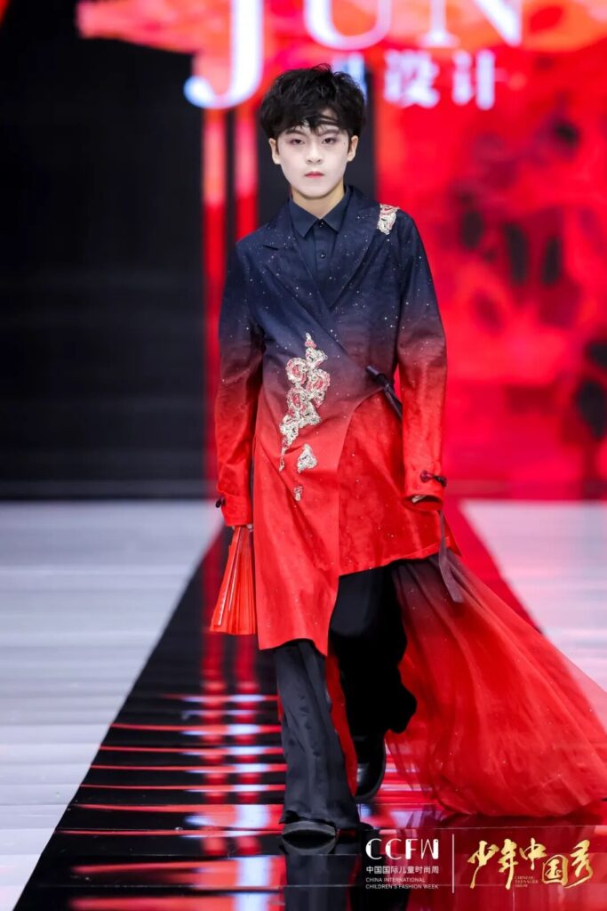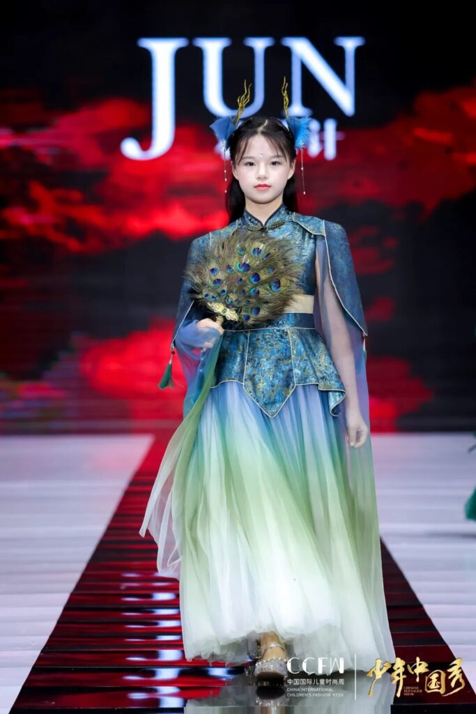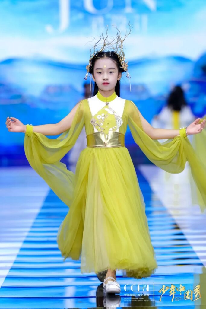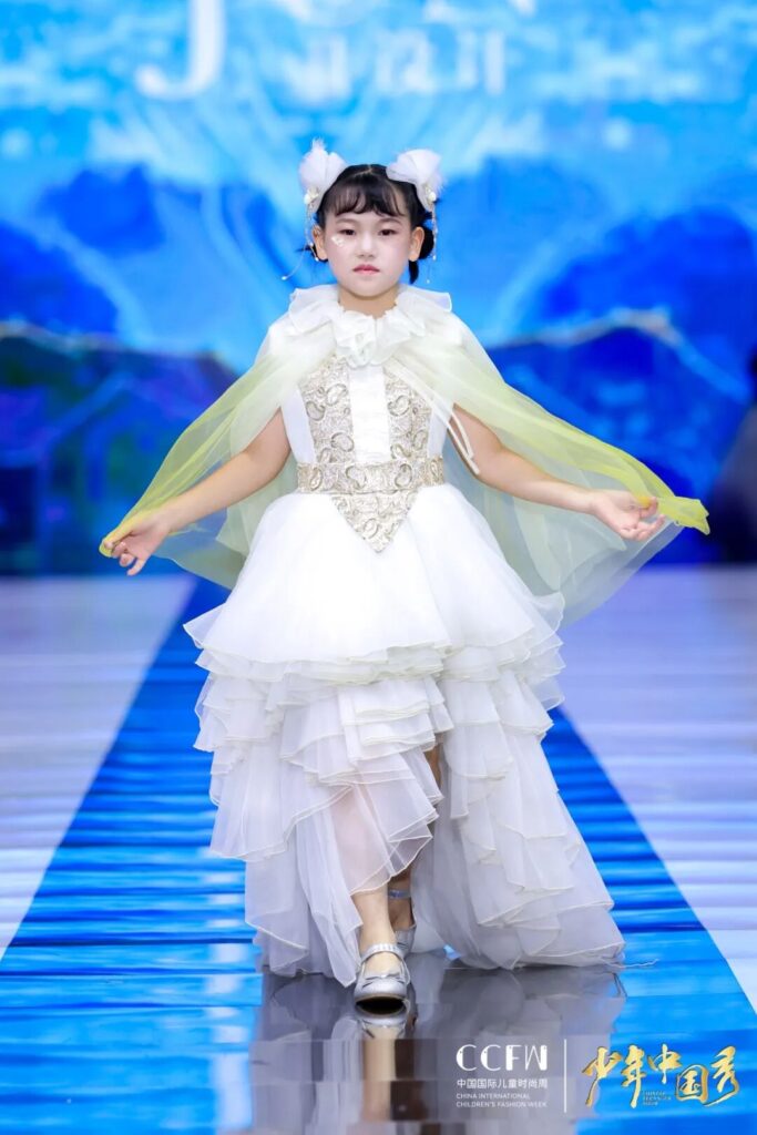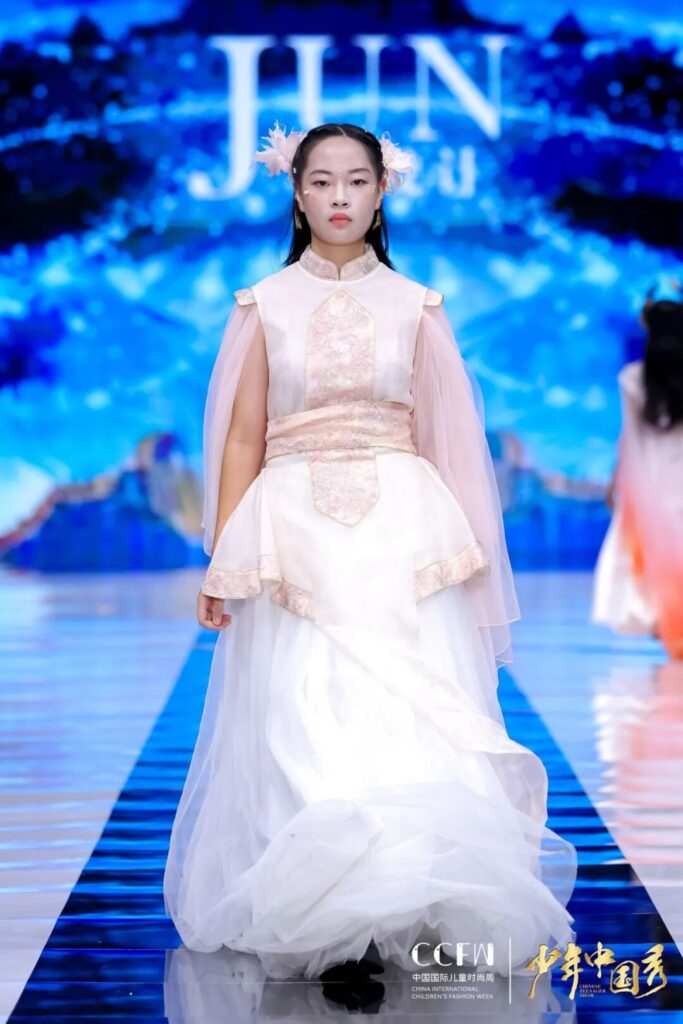 JUN君设计的秀场,是一个造梦空间。当小模特们身着融入花朵、翅膀等元素的服装款款走来时,他们不再是简单的展示者,而是化身为从故事里走出的花中仙子与天空精灵,天真烂漫又不失高贵典雅。