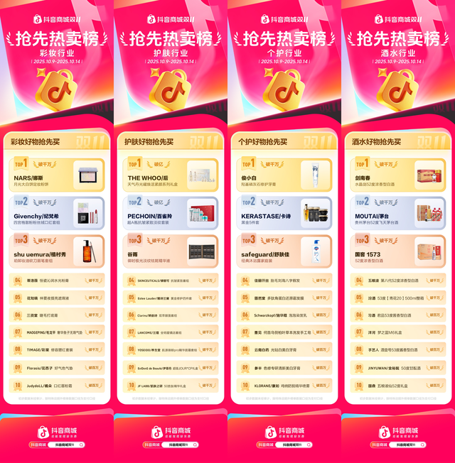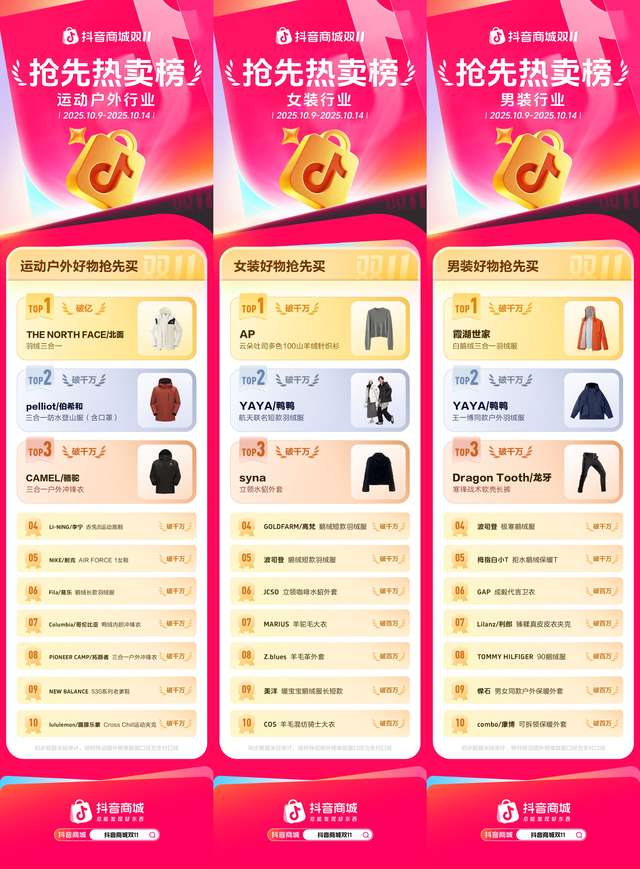 10月15日,抖音电商发布各行业双11“抢先热卖榜”,运动户外、护肤、数码等行业涌现爆款好物。